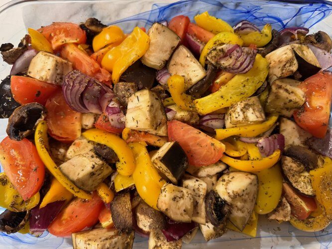 Ingredients 400 g tomatoes 1 eggplant 250 g mushrooms 1 red capsicum 1 red onion 1 tablespoon mixed herbs 2 tablespoons capers 2 tablespoons balsamic vinegar 2 tablespoons extra vi