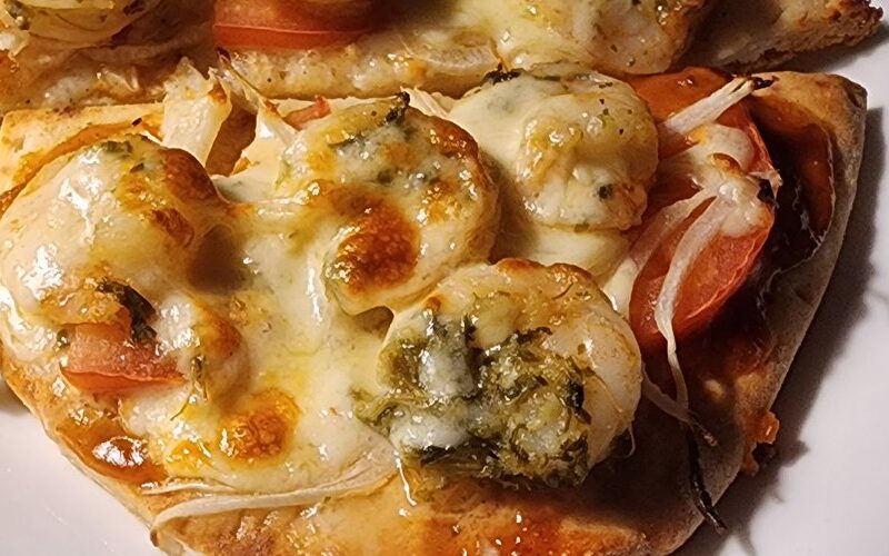 Ingredients 2 Garlic Naan (from Aldi) 4 tbsp Sundried tomato pesto 300 grams garlic prawns 1/2 finely sliced brown onion 1 cup lightly packed grated pizza cheese Method Spread the