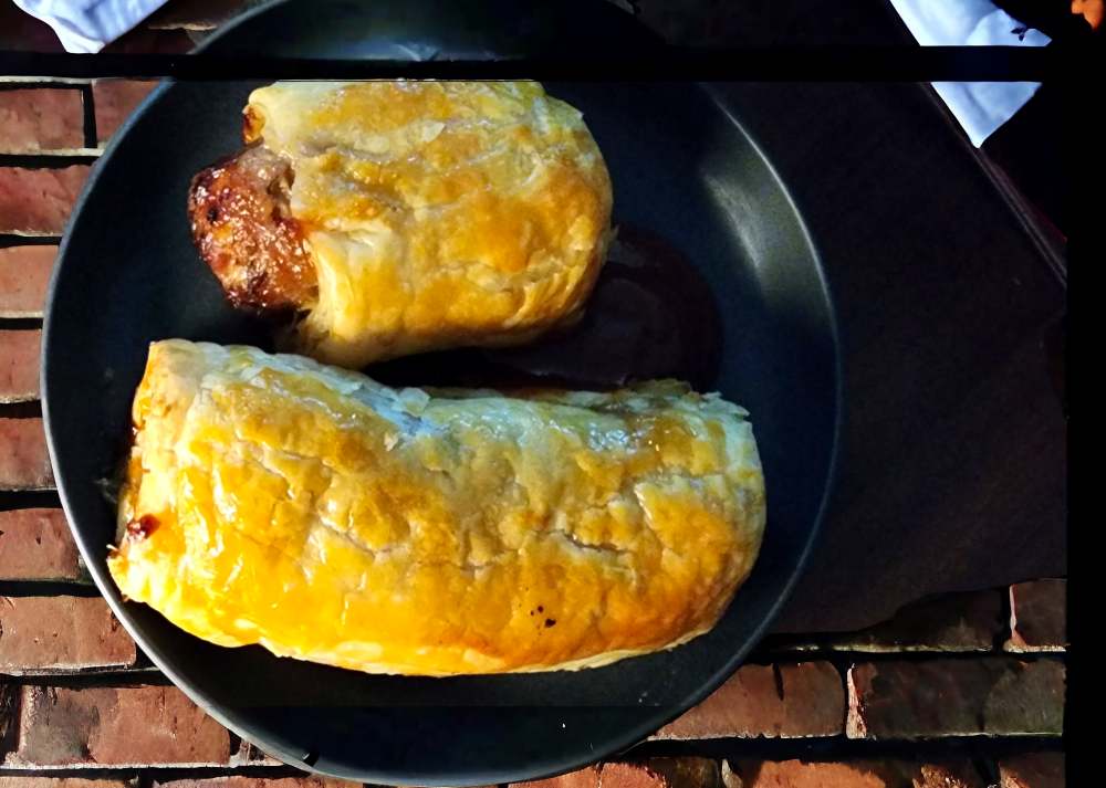 - Lay the sausages on each puff pastry sheet and roll up. (cut of any extra that you don’t need)